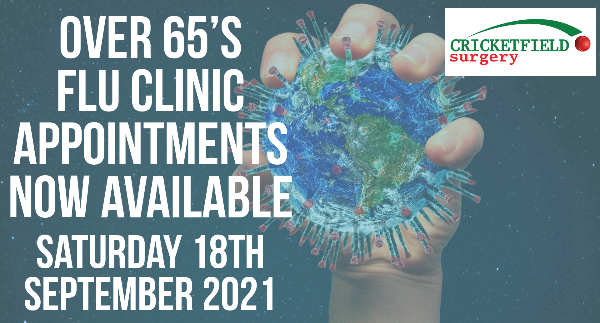 Cricketfield Surgery has opened up its first flu clinic appointments for Saturday September 18th. They are only for over 65 year olds but we will be putting more clinics on very soon and will notify those eligible when they are able to book. Please book online or contact the surgery on 01626 208020 after 10am.